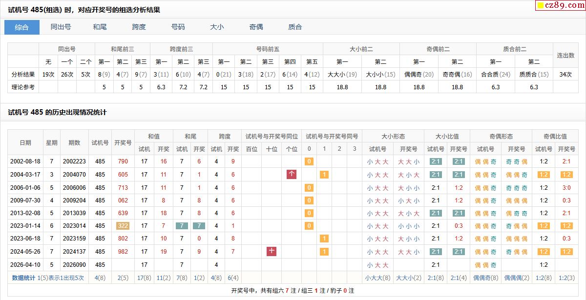 > 090期福彩3D试机号485对应开奖号的组选分析结果